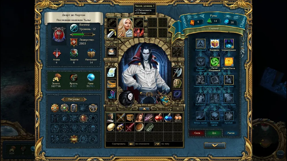 Пройдитесь по магазинам: весьма возможно, что ассортимент будет обновлен. Телепортируемся в замок духа Смерти, получаем свою первую жену - Люсию (да, она переходит на сторону тьмы). На данный момент будущее видится так: 2 счастливые женщины - орку, 2 вернейших мужчины - демонессе, 2 преданных свету - вампиру (у меня сверху есть пустое место для еще одного союзника). Итого вампир после первого острова получил дополнительно +2 интеллекта и +10 маны, а также 4 дополнительных слота для вещей. Прекрасно!