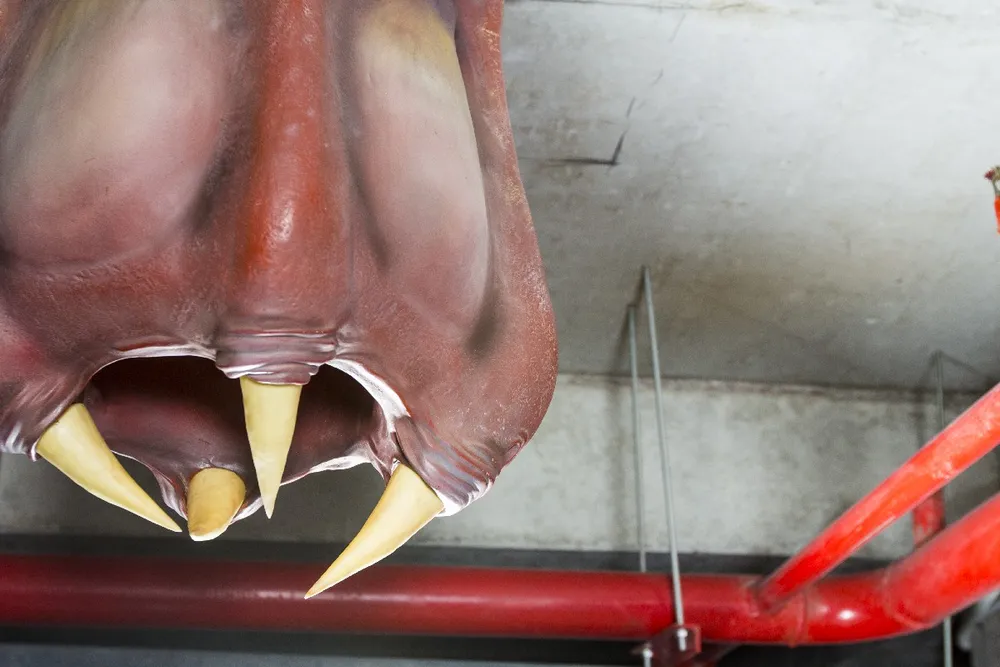 Арт-объект надежно прикручен к потолку при помощи 4 креплений в бетонном перекрытии паркинга. Хищник точно никому не свалится как снег голову, хотя он и не пытается.