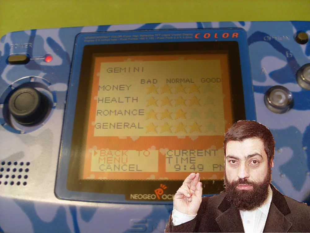 Эти функции включают в себя будильник (пищащий, надоедливый, то, что нужно), простейший календарь и забавный гороскоп, высчитывающий прогноз на конкретный день по графам Money, Romance и Health. Ничего особенного, но в то же время – один из первых шагов в сторону сближения портативных консолей с КПК (о самом первом я постараюсь скоро рассказать). Все эти мелочи подпитывает отдельная батареечка – таблетка типа CR2032.