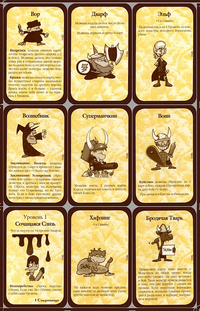 3. На руки игрокам выдаются по 2 карты из каждой колоды. Если это вещь - можете ее надеть, раса - использовать, монстр - оставить на будущее, бонус - заюзать сейчас или в определенный момент и т.д.