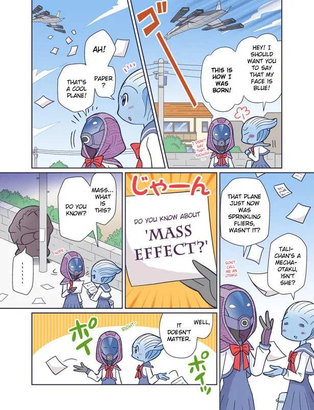 Главная героиня - кавайная школьница Лиара, мечтающая о своём учителе физкультуры Шепарде и сэнсэй Мордин, пытающийся объяснить ей все прелести игры в Mass Effect.