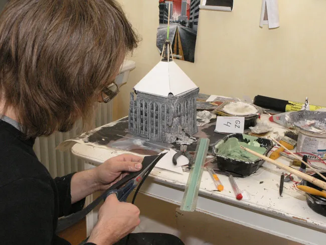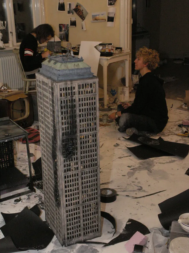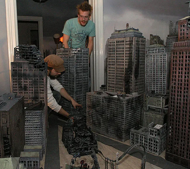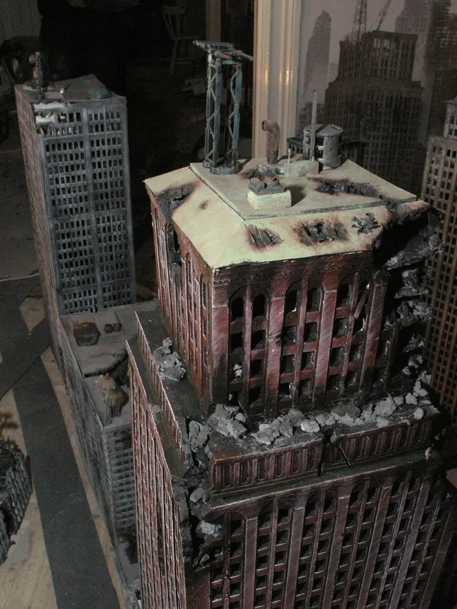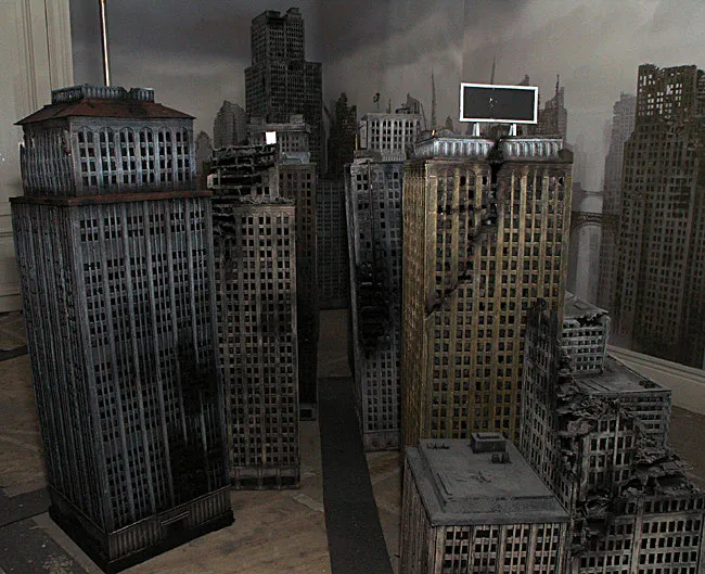 В результате кропотливого труда, сделанных вручную 50 полуразрушенных небоскребов и соответсвующих им обоев три комнаты были превращены в поле боя миниатюрных воинов.