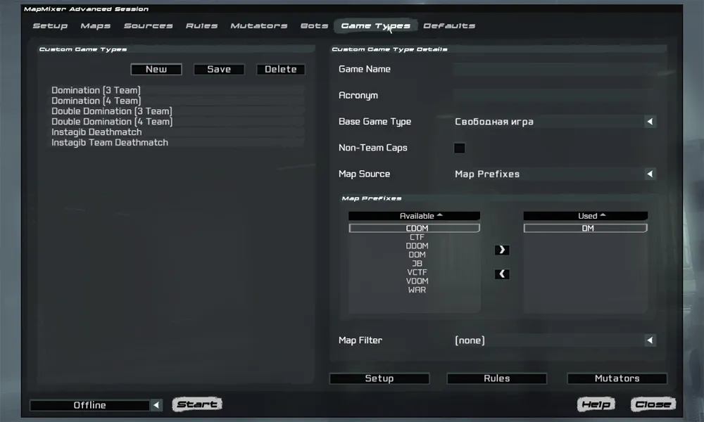 Основная идея MapMixer заключается в том, чтобы каждый следующий матч не был похож на предыдущий. То есть для каждой новой карты можно заранее запрограммировать свои правила. Можно чередовать типы игры, количество ботов, команд, мутаторов не выходя в главное меню! Сыграли, например, "Захват флага", а следующей картой можно поставить "Командный матч" или "Войну".