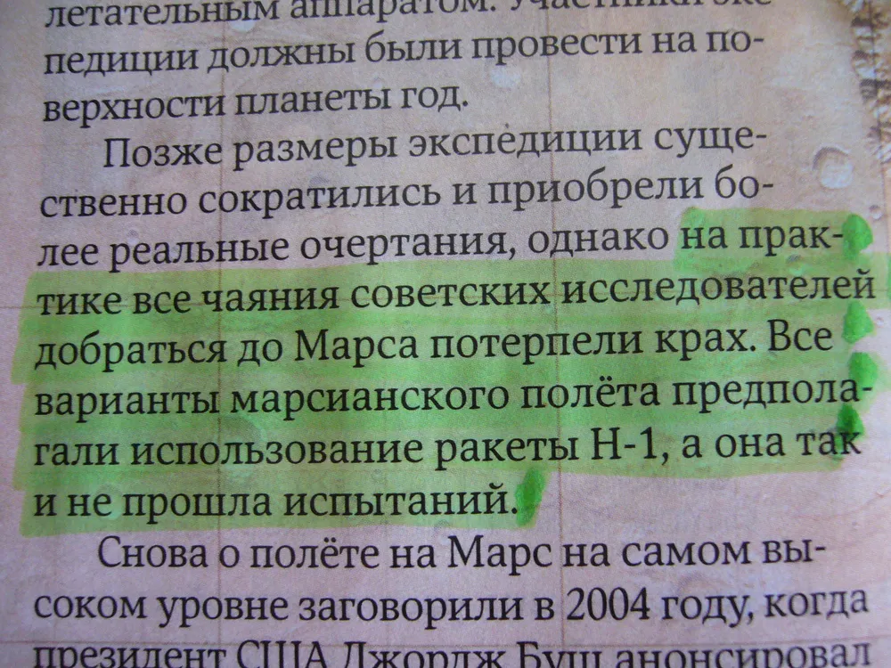 Н-1 не прошла испытаний? Та самая ракета, для испытаний которой было назначено шесть запусков, а выполнено – только четыре? Известно ли автору этой цитаты, что по поводу рухнувшей вскоре после старта Н-1 испытатели говорили: «Всё очень хорошо, она не взорвалась на старте!». То есть, конструкторы и испытатели считали первый запуск успешным: ещё бы, уникальное творение, подобного которому не знал мир, с первой попытки оторвалось от земли! Отработана сборка, вывоз, установка, заправка, подготовка пуска и сам пуск.