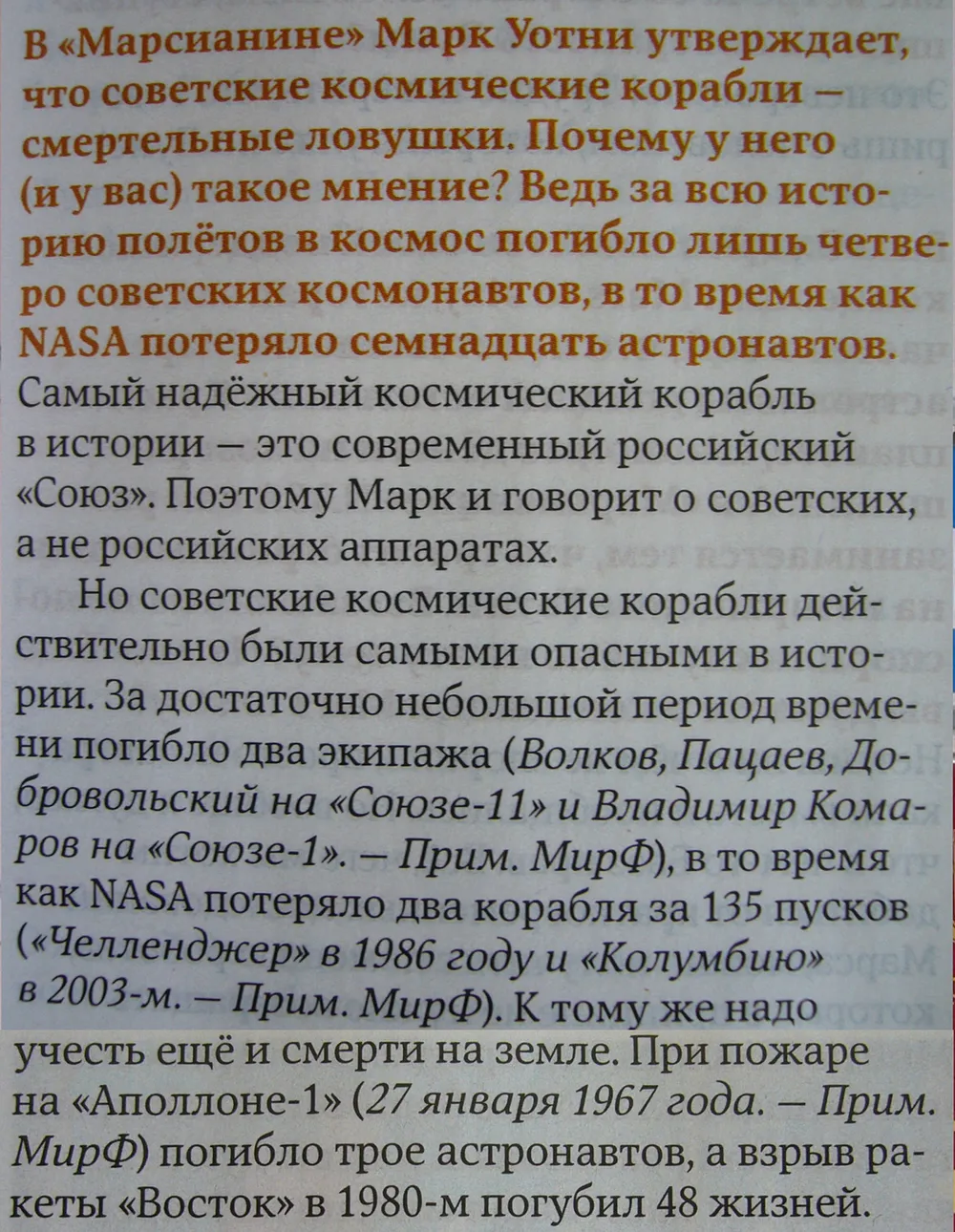 Что за ерунда? Человек, интересующийся космосом и написавший неплохую книгу, путает понятия "космический корабль" и "ракета-носитель"? И без малейшего сомнения объединяет два в одно: дескать, советские космические корабли унесли гораздо больше жизней, не забудьте про катастрофу с ракетой «Восток»! А авторы «Мира Фантастики» молчаливо соглашаются с этой нелепостью…