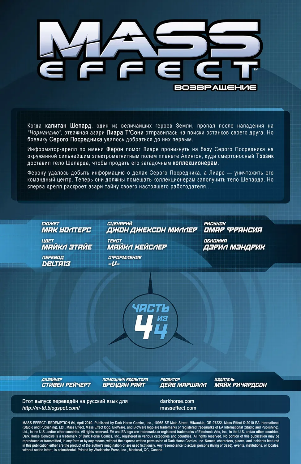 Привет друзья! Я был удивлён, когда не нашёл на нашем сайте поста о четвёртом комиксе серии Mass effect: Redemption, ведь вышел он уже довольно давно! (6 апреля, если быть точным, и уже в течении нескольких дней был осуществлён его перевод командой сайта http://m-td.blogspot.com/, за что им отдельное спасибо). Если кому-то лень лезть к ним на сайт (а там есть перевод всех комиксов этой серии, а так же перевод комикса "Incursion"!), то я выложил его сюда, можете прочитать его под спойлером ;) Скачать комикс вы можете тут или на их сайте. Приятного чтения!