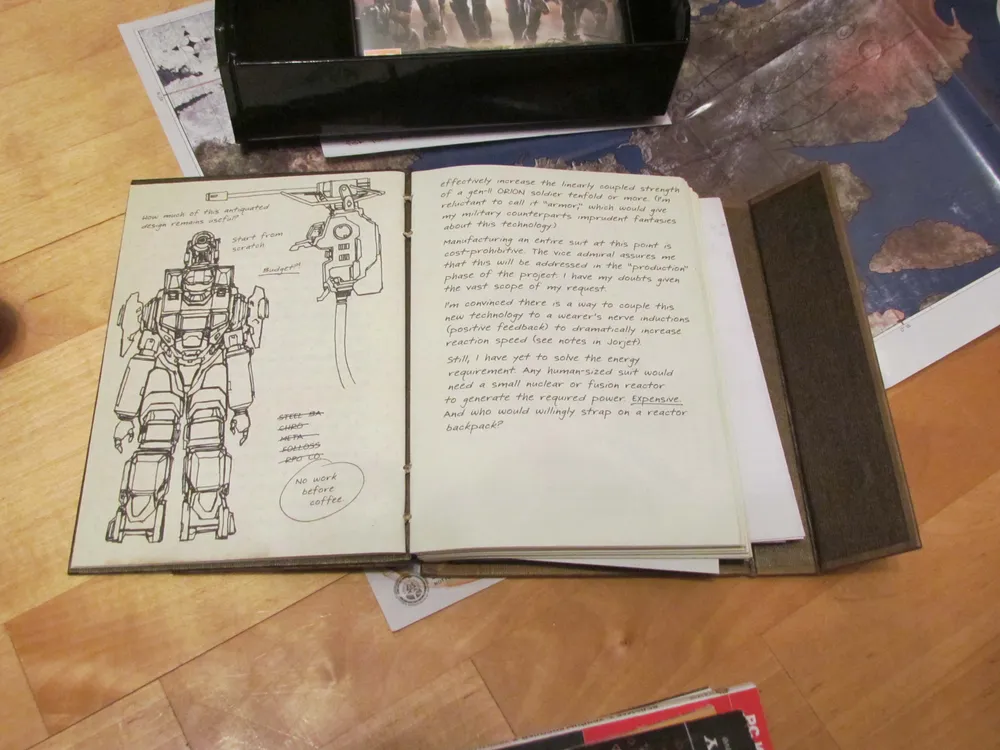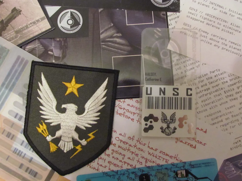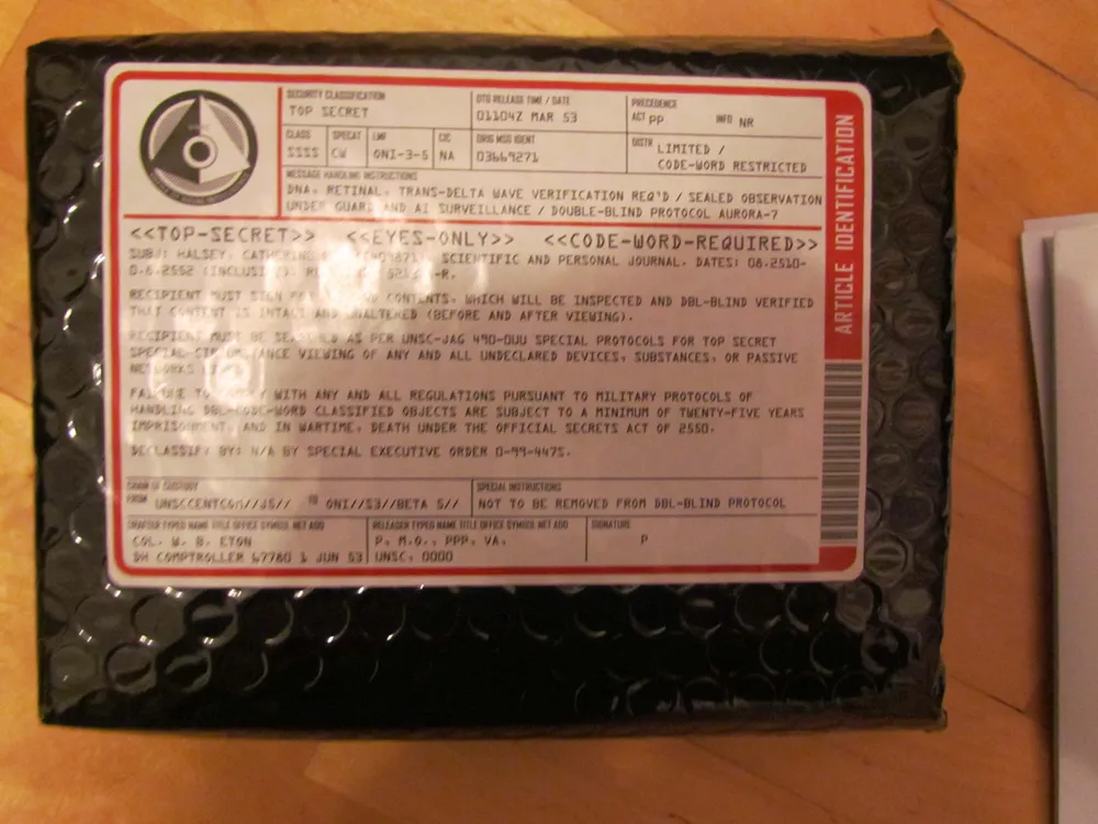 Открыв весьма толстую записную книжку (читать и читать), некоторое время любуемся прекрасным качеством бумаги и печати на ней, а после обращаем внимание на "потаенный" карман. В наши руки попадают десятки информативных листовок с самыми разнообразными данными (отпечатки пальцев "спартанцев", схемы атак, вырезки из газет, карта, фотографии и многое другое). Раздолье для фаната "Хало".
