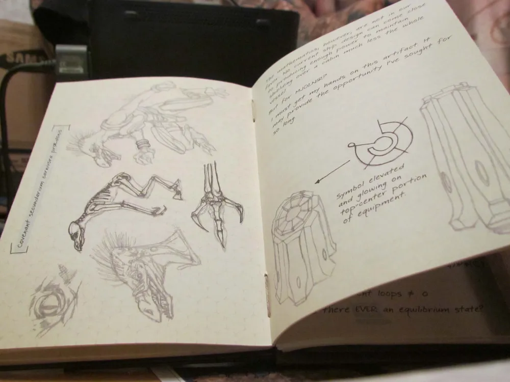 Самое ценное из того, что мы найдем в пакете, - книга с многочисленными записями. Главная ее особенность - вся писанина и все рисунки выполнены в карандашном стиле. Смотрится впечатляюще.