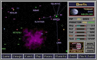 При помощи шести "резиновых" графиков, которые будут позже применены также и в Master of Magic, вы регулируете распределение населения на различные отрасли. Насколько увеличите один график, настолько уменьшите остальные. Графики отвечают за кораблестроение, планетарную оборону, индустриальную систему, экологию и научные исследования. Приятно, что все величины относительные, так что при приросте населения не приходится изменять значения графиков. Скажем, поначалу для увеличения прироста населения рекомендуется заботиться об экологии. Постепенно население планеты достигает максимума, и тогда компьютер автоматически переносит часть населения на постройку фабрик, таким образом освобождая от множества ненужных действий и обустраивая планету для достижения максимальной производительности.