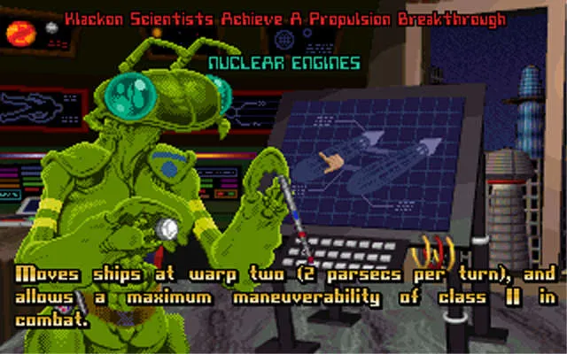 Науке в Master of Orion отведена не менее, а возможно - даже и более важная роль, чем дипломатии. Как и в управлении планетой, вы можете распределять имеющиеся у вас научные ресурсы по шести направлениям: компьютеры, строительство, силовые поля, планетология, двигательные системы и вооружение. Без технологического превосходства выиграть практически невозможно. Это особенно ярко выражено в космических сражениях. Один "высокотехнологичный" космический корабль способен уничтожить сотни "примитивных". А вот как вы добываете эти технологии - исследованием, шпионажем, обменом или же захватом - уже целиком вопрос стиля игры.