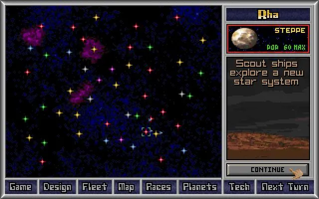 Вы начинаете, обладая всего лишь одной планетой. Много это или мало? В Civilization этой цели (обладания всей планетой) вы старались достичь всю игру. Но в мире Master of Orion это только начало долгого пути. Вокруг вас множество неизвестных звезд различных цветов, свидетельствующих о возрасте звезды. Чем старше звезда, тем меньше на ней ресурсов, но тем лучше на ней климат. Для того, чтобы узнать, пригодна ли звезда (приравненная к планете) для колонистов, следует послать любой корабль из вашего флота. Если же она пригодна, то смело посылайте корабль с колонистами и называйте вашу первую колонию звучным именем. На каждой планете живёт несколько десятков миллионов колонистов.