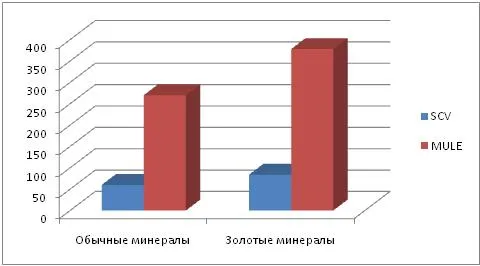 Почему-то принято считать, что с золотых минералов ресурсы добываются быстрее. Это не совсем корректно, ведь процесс добычи проходит с той же скоростью, а вот величина «слитков», которые таскают рабочие, увеличена на 40%. Кроме того, золотые минералы, на самом деле, далеко не так выгодны, как кажется на первый взгляд: при почти оптимальной загрузке своего меина (или любой базы с 8 кучками минералов) терран добывает, как уже было подсчитано выше, около 3120 минералов в минуту (при реальной загрузке в 16 SCV и 1 MULE – 1230), в то время как золотые минералы, как правило, раскидывают по 6 кучек на нычку, т.е. при оптимальной загрузке вы получите отдачу примерно в 546*6=3276 минерала в минуту, а при реальной загрузке – 12*84+378=1386 единицы ресурсов, т.е. разница между одинаковыми загрузками составляет 156 минерала в минуту, а это, в общем-то, не такое уж и существенное число для долгой макроигры (в которой, как правило, и участвуют золотые минералы). Так что далеко не всегда стоит отчаянно драться за «золотую» локацию, вместо которой вы можете спокойно взять нычку на 8 обычных кучек минералов и жить припеваючи; особенно если учесть, что золотые минералы закончатся намного раньше! С другой стороны, золотые минералы окупаются несколько быстрее, и для них, как правило, нужно несколько меньше рабочих, поэтому если вам нужно максимально быстро окупить свою нычку, то стоит попробовать занять именно золотые минералы.