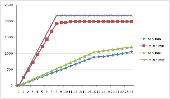 - При N>K эффективность N мулов такая же, как и К мулов, и их RPM вычисляется по формуле 270*K, сколько бы их ни было, т.е. К+1-й и последующие мулы на этой базе экономически невыгодны.