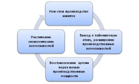 3. Восстановление армии через новые производственные мощности: теперь мы продолжаем строить нон-стопом армию (понятно, что при старых экономических возможностях мы сможем это делать только недолгий период времени), в это время мы можем не «набирать» лимит, т.к. мы его уже частично «слили», таким образом получая немного свободных ресурсов для поддержки новых производственных мощностей;