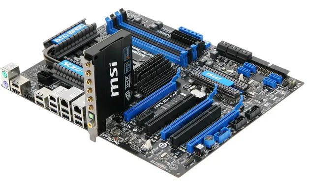 Оснащение и функционал производят не менее сильное впечатление. Fuzion построена на чипсете Intel P55 и способна работать с LGA 1156 процессорами Core i3/i5/i7. Благодаря Lucid Hydra 200 на плате удалось реализовать три PCI-E x16 слота. Как уже говорилось, в этих слотах в тандемах могут быть использованы разнобрендовые графические ускорители. В разгоне плата способна работать с памятью DDR3-2133, имеет 10 разъемов SATA-II (шесть средствами P55 и еще четыре силами JMicron JMB322) и пару eSATA (благодаря JMicron JMB363), плюс пару интерфейсов GigabitEthernet. В имеющийся на плате PCI-E x1 слот устанавливается комплектная восьмиканальная звуковая плата Quantum Wave, поддерживающая THX TruStudio PC и Creative EAX Advanced HD 5.0. Проще говоря, MSI вложила добротный звук в коробку с “материнкой”, он заметно качественнее привычных встроенных решений.