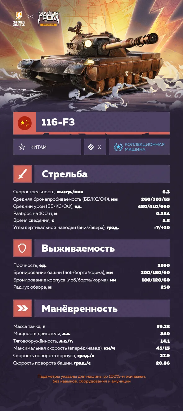 Главная награда — новый танк X уровня 116-F3. Он способен аккуратно лавировать от одной засады к другой, терпеливо выслеживать противников, а затем поражать их ударом со средним уроном в 480 единиц.
