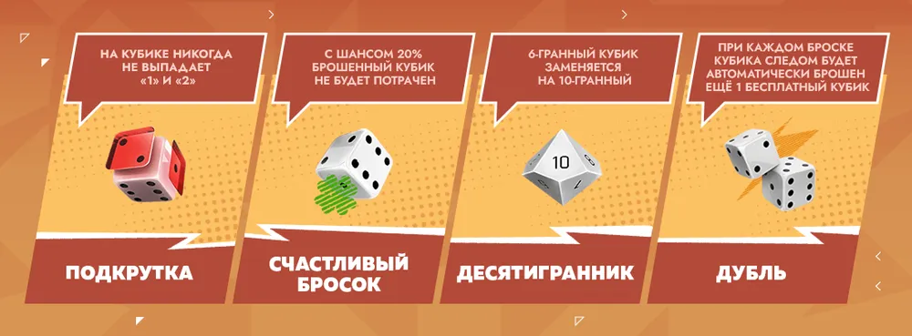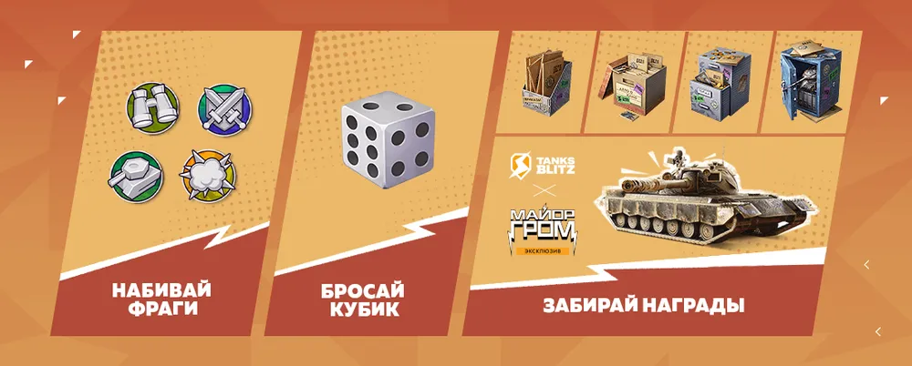 Это — дебют новой механики в Tanks Blitz. За каждые 5 уничтоженных танков игроки будут получать Кубик. Выпавшее значение равно количеству шагов, на которое можно продвинуться по игровому полю события. Но можно ускорить дело с помощью улучшений — например, «Подкрутки», благодаря которой на Кубике не будут выпадать мелкие значения, 1 и 2. А еще его можно сделать десятигранным! Все купленные улучшения работают до конца события.