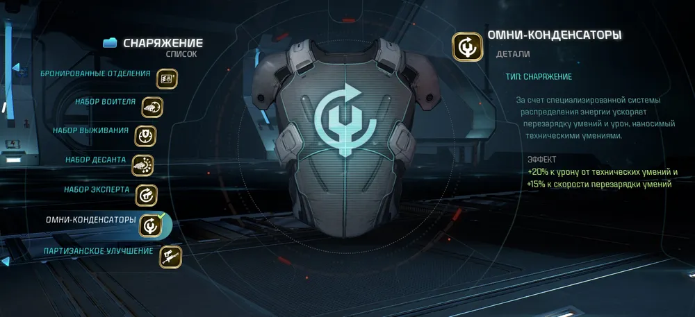 А вот вариантов снаряжения немного, поскольку оно должно усиливать до максимума важнейший из ваших навыков. Исходя из этого, берите Инженерный набор или Омни-конденсаторы.