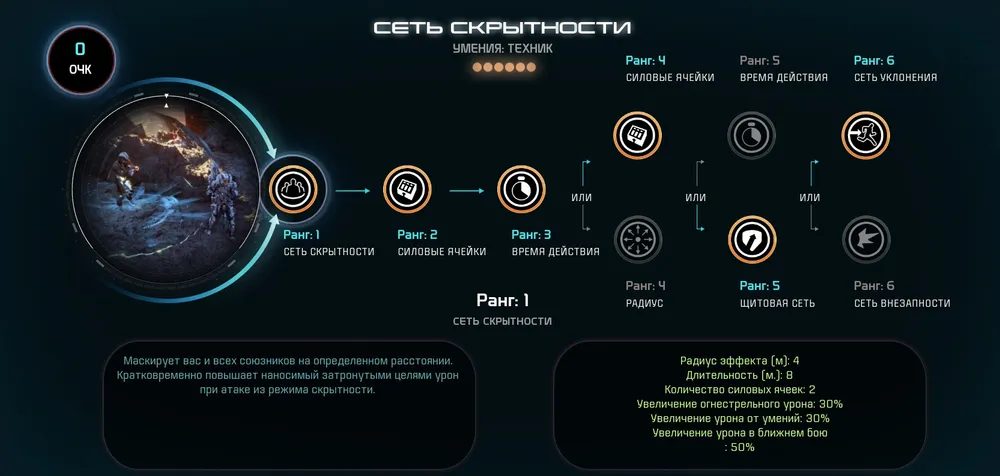 2. Сеть скрытности - незаменимый навык, обеспечивающий тотальное тактическое превосходство над тупоголовыми мобами. Не мешает восстановлению щитов. Использует силовые ячейки. Действует на игроков без сознания. Сброс маскировки - 0.5 сек.