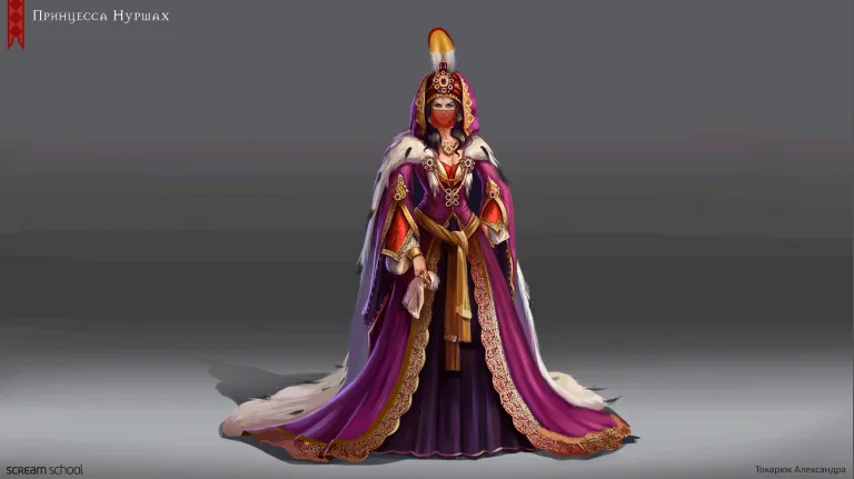Изначально планировалось изобразить принцессу в более светлых тонах, в соответствии с нарядами девушек Ближнего Востока, но дабы показать её ужасный и кровожадный характер, Саша остановилась на тёмных.