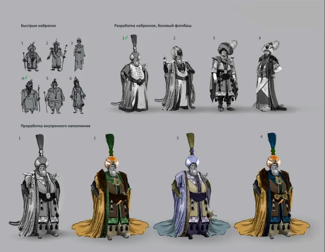 Для подчёркивания властного человека были добавлены посох и горностаевая мантия.