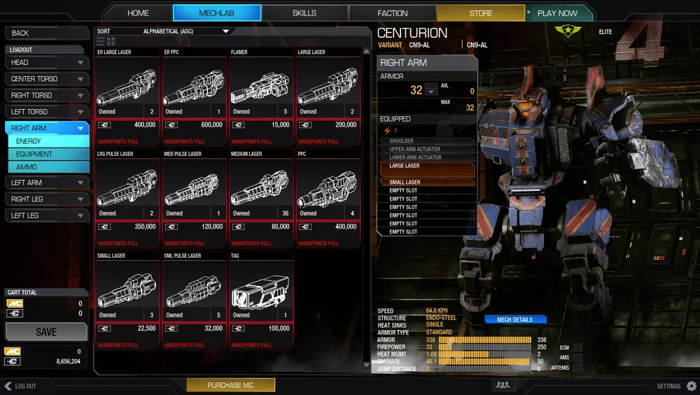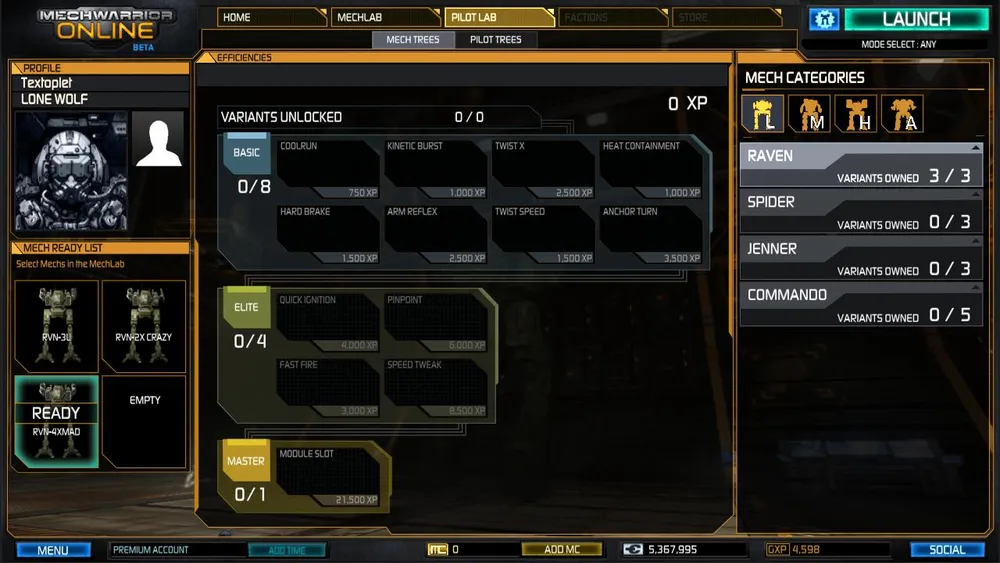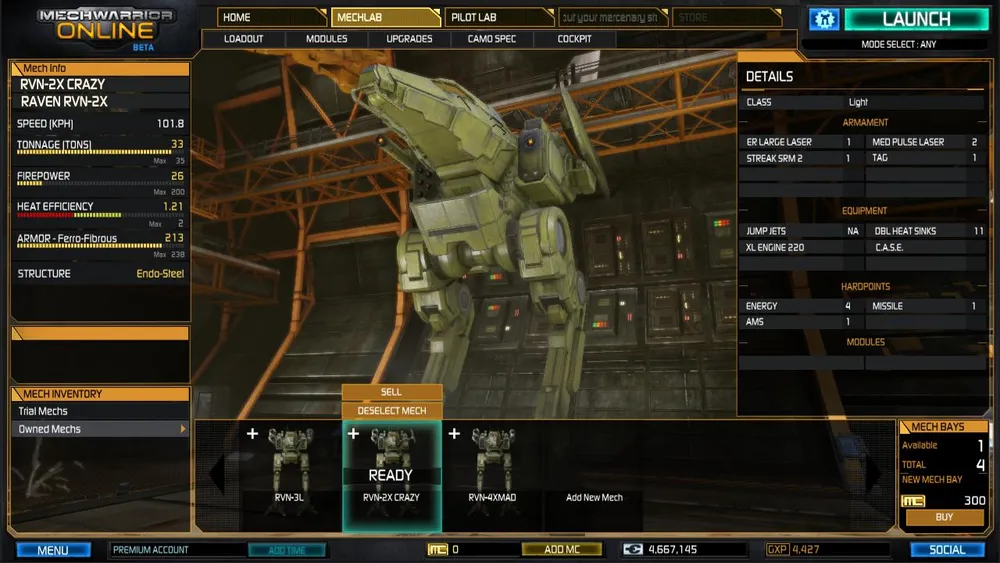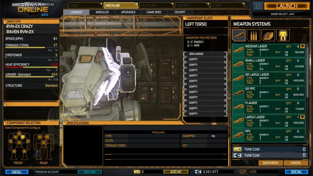 Итак, набив руку на Trial'ных мехах, научившись работать в команде и стараться не лезть в пекло, где разорвут в два счёта, оказываются накоплены средства для покупки своего меха. И теперь открывается следующая сторона - мехлаб. Покупка оборудования, вооружения, установка и оснастка своего меха. Навыки игры важны, и именно поэтому важно собрать мех, который устроил бы личный стиль меховода.