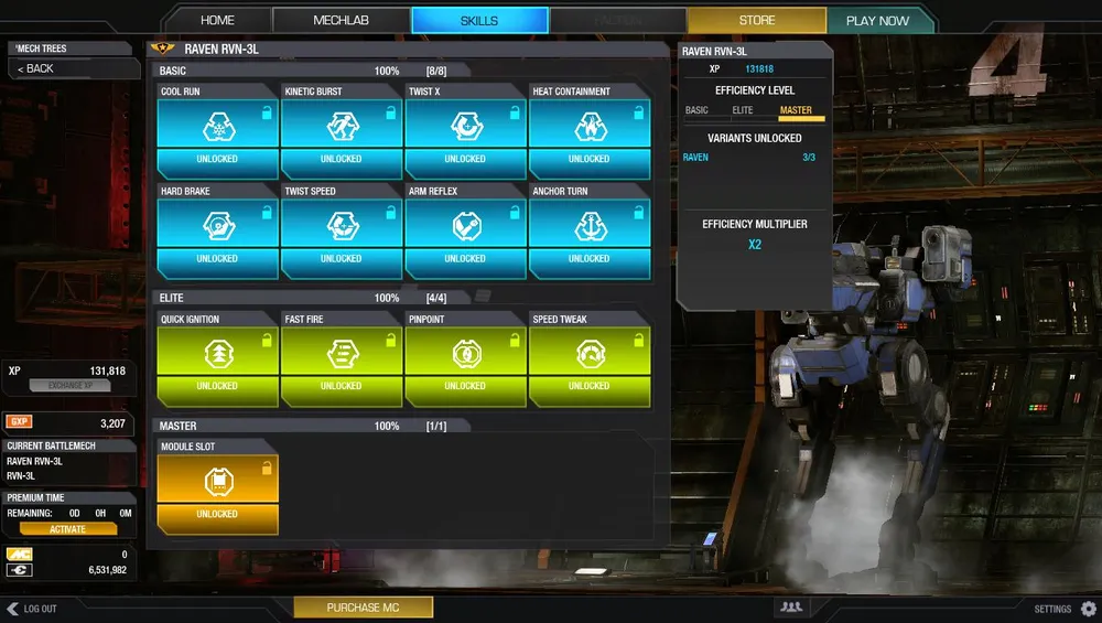 XP - опыт специализированный для конкретного меха, на котором игрок участвует в боях. Тратится в (раньше называлось Pilot lab) вкладке Skills, раздел Mech tree на приобретение бонусов, например, повышение скорости меха, увеличение угла поворота торса вокруг оси и тому подобные прибавки к параметрам меха. Всего три ступени бонусов: Basic, Elite и Master - последний даёт ещё один слот для модулей. Чтобы открыть доступ к приобретению следующей ступени, нужно заполнять все предыдущие трём мехам одной модели.
