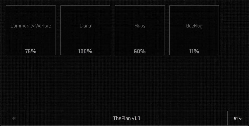 В конце 2013 года разработчики озвучили план дальнейшей разработки, назвали его The Plan V1.0. На настоящий момент страничка для наглядного отображения хода работ выглядит так: