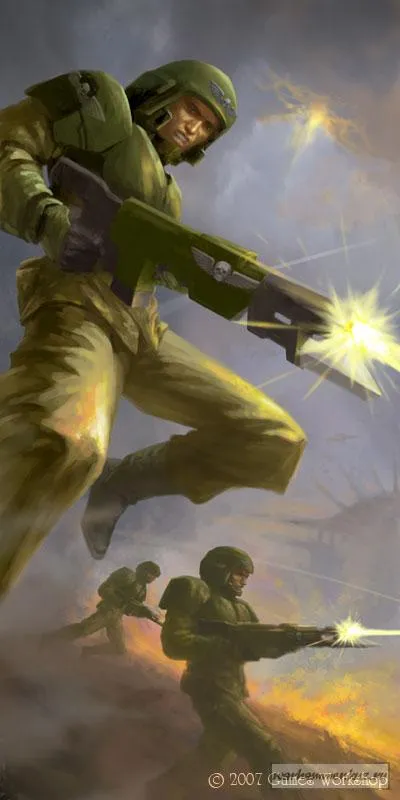 Внизу зашевелились активнее, и эльдарская пехота открыла огонь. Воздух наполнился свистом их странных снарядов и резкими щелчками, с которыми они отскакивали от камней. Когда они подошли ближе, плотность огня возросла и гвардейцы начали стрелять в ответ. Сот одобрительно кивнул, оценив четкость и аккуратность ответного огня. Продвижение эльдар замедлилось, однако теперь, под прикрытием пехоты и продолжающихся налетов гравициклов, показалась новая угроза. В нескольких местах среди кустов и каменных выступов установили турели и на гвардейцев обрушился более сильный огонь. Началась смертельная схватка между хорошо укрытыми пушками обороняющихся и плавно двигающимися гравитанками эльдар — а чужацкая пехота неуклонно приближалась.