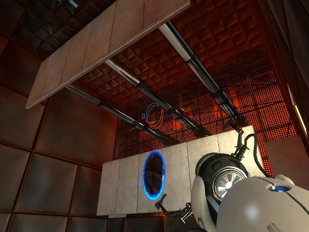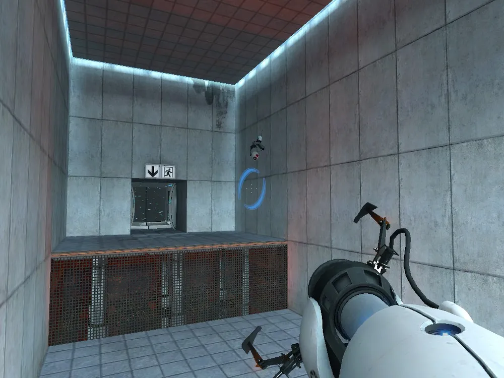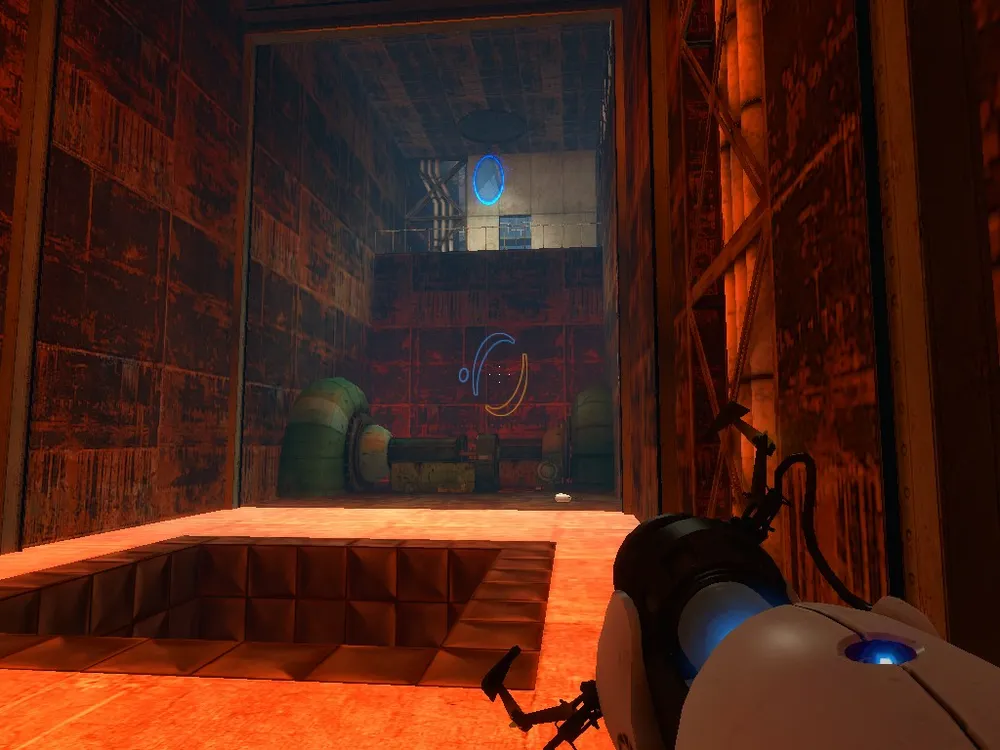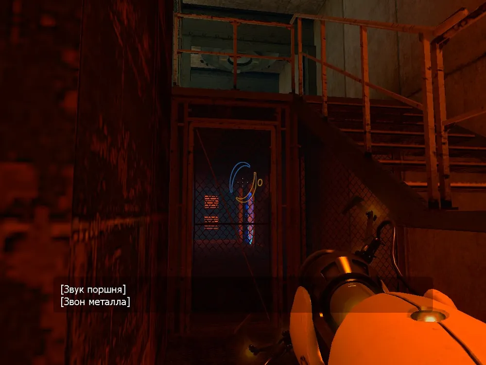 Расположите 1 портал возле будки, 2 портал на нижней платформе и прыгайте. Передача ловится возле кнопки у дальней стены комнаты.