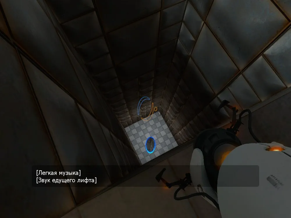 Также на скрине показано расположение первого портала для получения приемника. Второй портал расположите на дне ямы, в которую складывается лестница, затем спрыгните в портал и на лету схватите приемник. Передача ловится в следующей комнате с опускающимися платформами.