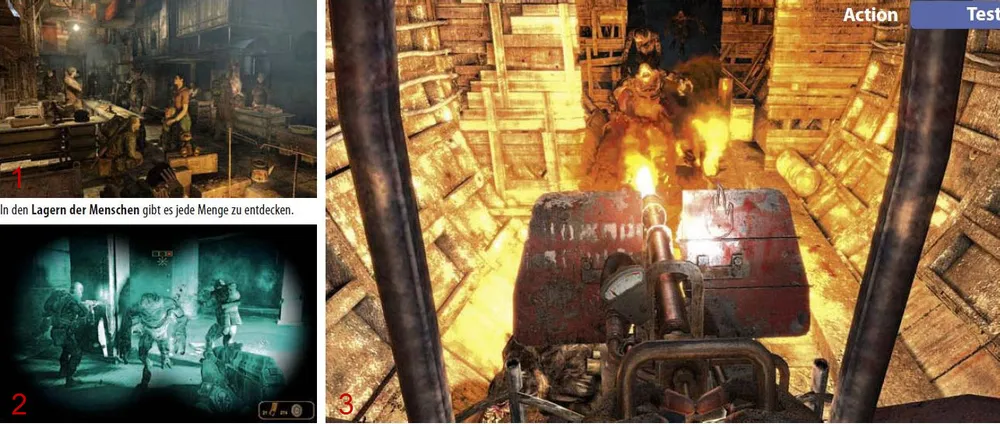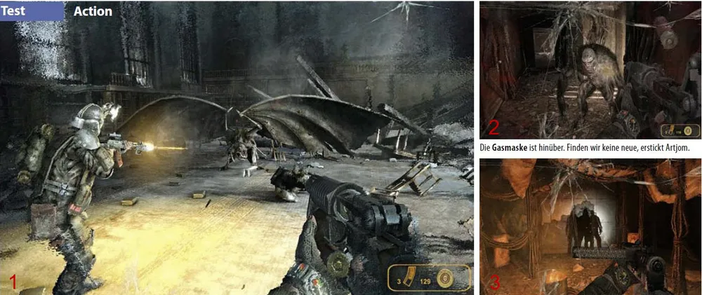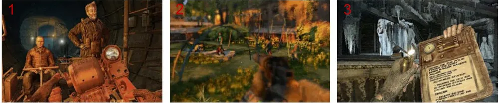 Метро в 2033 произвела на нас впечатление своим атмосферным игровым миром. При этом сцены показанные между миссиями (1) производят такое же большое напряжение как и таинственные сны Артёма (2), которые неожиданно посещают его снова и снова, как и в романе-первоисточнике. Кроме того игра подкупает своей любовью к деталям. Например, актуальное задание Вы найдёте, не в текстовом сообщении, как в других играх, а в пожелтевшем блокноте (3), который Артём при необходимости освещает зажигалкой.
