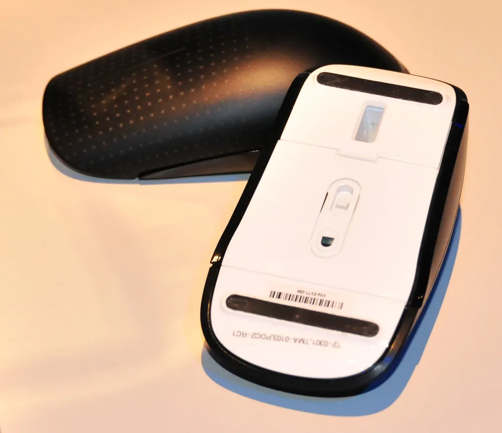 В целом форма Microsoft Touch Mouse вполне традиционная, если не считать толщину в том месте, где располагаются кончики пальцев — она минимальна, что способствует более естественному положению кисти и меньшей утомляемости при работе. Если перевернуть мышь, то взгляду открывается лазерный сенсор, произведенный с использованием BlueTrack — фирменной технологии Microsoft. Мышь может работать практически на любой поверхности, за исключением стеклянных и зеркальных.