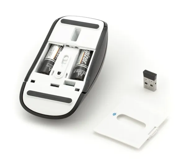 Нижняя поверхность мыши выполнена в ослепительно-белом цвете. Выделяется лишь прорезь сенсора, две продолговатые накладки и логотип BlueTrack. В задней части находится отсек для батареек АА. Прямо на крышке отсека для батареек находится специальное углубление, куда можно вставить приемник при необходимости транспортировки.