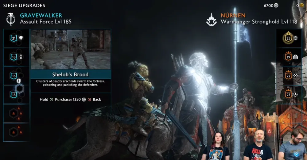 - - Перед началом штурма мы можем покупать различные улучшения для своей армии. Например, можно взять с собой грауга, чтобы тот сломал стену, или отправить полчище ядовитых паучков, чтобы те привнесли немного паники на сторону врага. Ассортимент подобных улучшений зависит от того, каких орков мы берем с собой на штурм (update: возможно не зависит).
