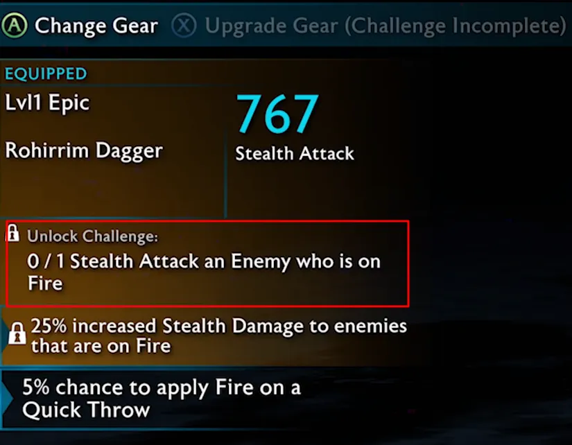 - - Уровень экипировки и ее свойства можно улучшать, выполняя челленджи. Пример челленджа: скрытно убить врага, когда он горит. Чем круче свойство, тем сложнее челлендж для его открытия.