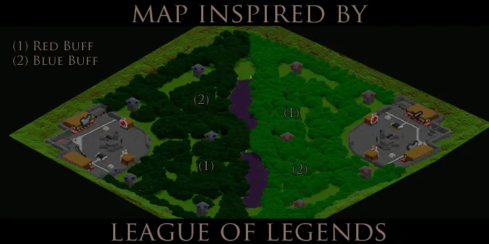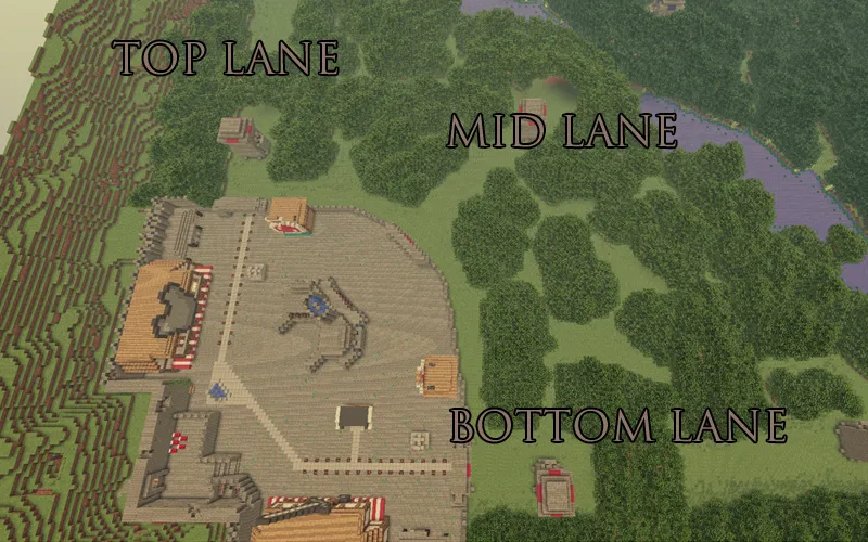 Как показано ниже, существуют 3 зоны: верхняя, средняя, нижняя. Каждая имеет по 2 башни, кроме средней (в отличии от DOTA). По крайней мере 1 игрок должен защищать каждую из башен.