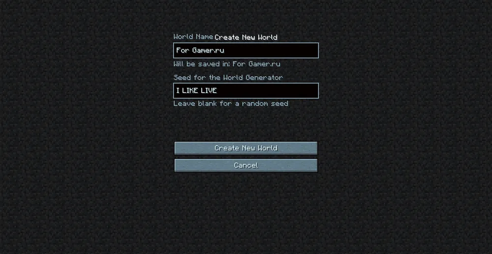 И видите меню. Всё стандартно, удивляться не надо, просто заходим в одиночную игру (Singleplayer), создаём новый мир (Create New World), вводим его имя и удивлённо смотрим на поле "Зерно". Бежать из комнаты с криками уже поздно, так что просто знайте, что "зерно" генерирует уровни. Если его не указать, то оно получается рандомным. Писать туда можно что угодно и единственная (из известных мне) полезность этого поля - возможность начать играть с другом на одинаковой карте. Или сгенерировать карту сначала, если она очень вам приглянулась, а вы нечаянно взорвали гору динамитом. Другого применения "Зерну" пока нету, так что делайте с ним то, что считаете нужным и заходите в свой новый мир.