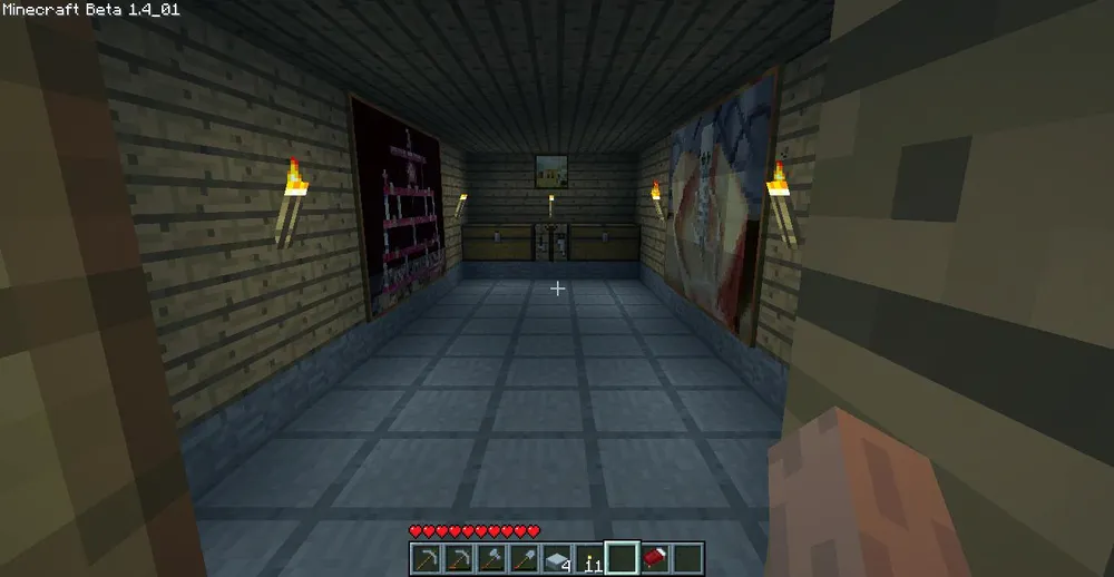 С плитами (они занимают пол клетки в высоту) на пол тоже нет никаких проблем, три камня в ряд в верстаке и три плиты готовы. Только время придётся потратить . Но и тут есть небольшая хитрость. Как вы уже могли заметить, при сворачивании игры (или при переходе в другое окно), игра автоматически выходит в меню. Но если это сделать при открытом инвентаре или открытой печи/сундуке, то игра продолжит свою жизнь без вашего участия. А в это время печь уже исполнит свою работу и вам останется лишь зайти за полученными вещами. Ну и ещё на стенках висят картины, но право, что необычного в овечьей шерсти, обставленной в верстаке палками? Ну, разве что только необычное свойство картин быть всё время разными...