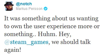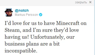 Я бы хотел, чтобы мы имели Minecraft в Steam, и я уверен, что они разделяют моё мнение! К сожалению, наши бизнес-планы немного несовместимы.