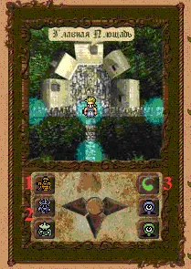 Под картинкой есть кнопки передвижения (верх, вниз, влево, вправо), кнопка, открывающая список монстров на локации (1), кнопки, отображающие персов и торговцев в данной локации (2. с лева – рядом с вами, с права – в пределах нескольких шагов), и кнопка обновления миникарты (3).