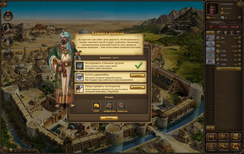 Торговля на востоке – это искусство, а Халид в нем настоящий мастер. Он обладает ценными связями и лучше всех осведомлен о ситуации на рынке. Хотите научиться покупать, а затем продавать, получая прибыль? Внимательно слушайте Халида, следуйте его советам и тогда в казне всегда будет раздаваться звон золотых монет.