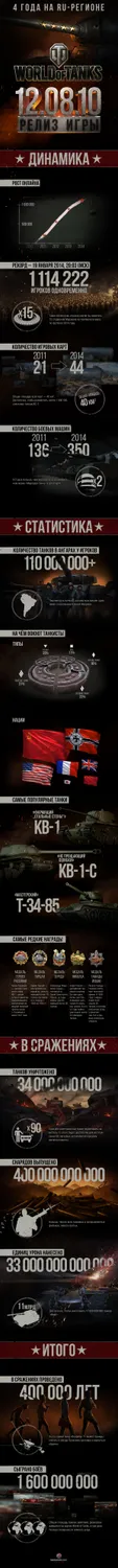 Четыре года идут бои на полях World of Tanks: танкисты нажимают кнопку В бой!, а мы поставляем им новые машины и карты и вместе решаем новые боевые задачи. Пришло время подвести итог! Мы подготовили для вас полный отчёт за четыре года: сколько танков в ангарах, на чём воюют танкисты и какие награды труднее всего получить.