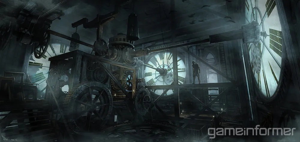 Выше можно увидеть убежище Гаррета (Garrett) в верхней части часовой башни, что является примером виденья командой стимпанка. "Художественный стиль стимпанка это золото и дерево -- см. фильм Дикий, дикий Вест (Wild Wild West) с Уиллом Смитом. Это то, от чего мы без сомнения хотим избавиться. Нам действительно больше нравятся ржавый материал, где видны следы сварки"