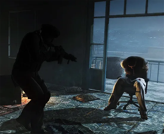 Благо, на вашем новеньком М4A1 навешано куча новомодных примочек, одной из которых является 15-ти сантиметровый глушитель. Выстрелом в голову, вы почти бесшумно убираете сначала одного, а затем сразу же второго русского, да так, что те не успевают проронить ни звука.