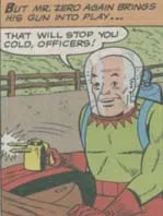 Первое появление Мистера Фриза в мире Тёмного Рыцаря случилось лишь в 121 номере комикса "Бэтмен. Ледяные преступления Мистера Зеро.", вышедшего под авторством Дейва Вуда и Шелдона Молдоффа в феврале 1959 года. Я думаю, что достопочтенная публика уже обратила своё пристальное внимание на тот факт, что в названии комикса речь идёт о неком Мистере Зеро, а совсем не о Фризе. Действительно, Зеро стал прообразом того Мистера Фриза, каким мы его знаем теперь. Итак, что нам известно о Мистере Зеро из комиксов DC? Зеро предстаёт перед нами в образе преступного гения, который в ходе одного из экспериментов над собственным изобретением - замораживающей пушкой, проливает на себя замораживающий раствор и становится существом, способным дышать лишь при минусовой температуре, иначе он просто умрёт. Обстоятельства вынудили учёного создать для себя специальный охлаждающий костюм, который к тому же являлся и оружием и броней - такими необходимыми атрибутами преступника на улицах Готэма. Отличительными особенностями злодея были зеленовато-красный костюм, постоянная улыбка на лице и фургон мороженщика, который он использовал для прикрытия во время своих нападений на банки Готэма - согласитесь, все эти черты вряд ли добавляли Зеро грозности и суровости, он скорее воспринимался, как шуточный злодей, нежили серьёзный противник Летучей Мыши. Это и послужило одной из причин того, что Мистер Зеро продержался в комиксе всего несколько выпусков, и в следующий раз сценаристыDC Comics вспомнили о нём лишь через почти через 10 лет. Кстати говоря, в финале истории с участием Зеро, во время последней битвы Бэтмена и Робина против банды учёного в его логове разрушается паровая труба, и главным итогом становится даже не то, что Зеро повержен, а то что злодей обнаруживает, что "паровые ванны" вновь превратили его в обычного человека, что он снова может существовать при нормальных условиях без специального оборудования. Небольшое отступление: как утверждают сами создатели комиксов во вселенной Бэтмена, Мистер Зеро является альтернативной версией Мистера Фриза, живущей на Земле-2 (о сути альтернативных миров я рассказывал в одном из комментариев к моим предыдущим постам, ссылка на них будет дана ниже), в то время как всем нам известный Фриз живёт в "нашем" мире, на Земле-1. Разница в том, что альтернативный злодей смог излечиться паром, в то время как канонический Фриз остаётся полузамороженным непонятно чем.