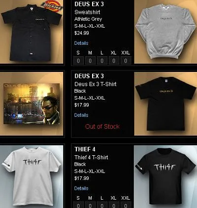 Так вот, оказалось, что студия Eidos Montreal уже давно продаёт через свой интернет-магазин массу всяких товаров с символикой этих двух игр. Здесь вы сможете обнаружить постеры, кепки, сумки, шарфы, рубашки с логотипами Deus Ex 3. Там же недавно появились две футболки для фанатов Thief 4. Стоимость этой атрибутики варьируется в районе 0-$30. Поклонникам определённо понравится.