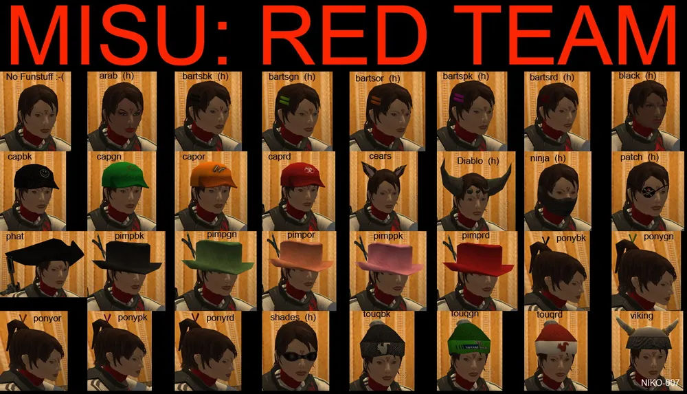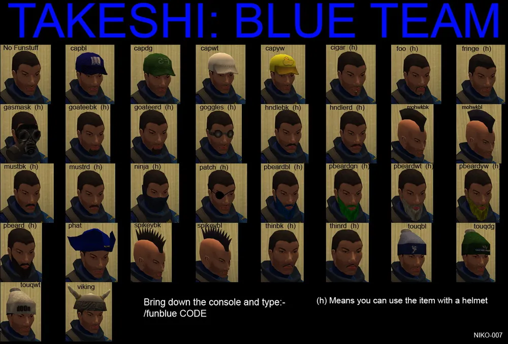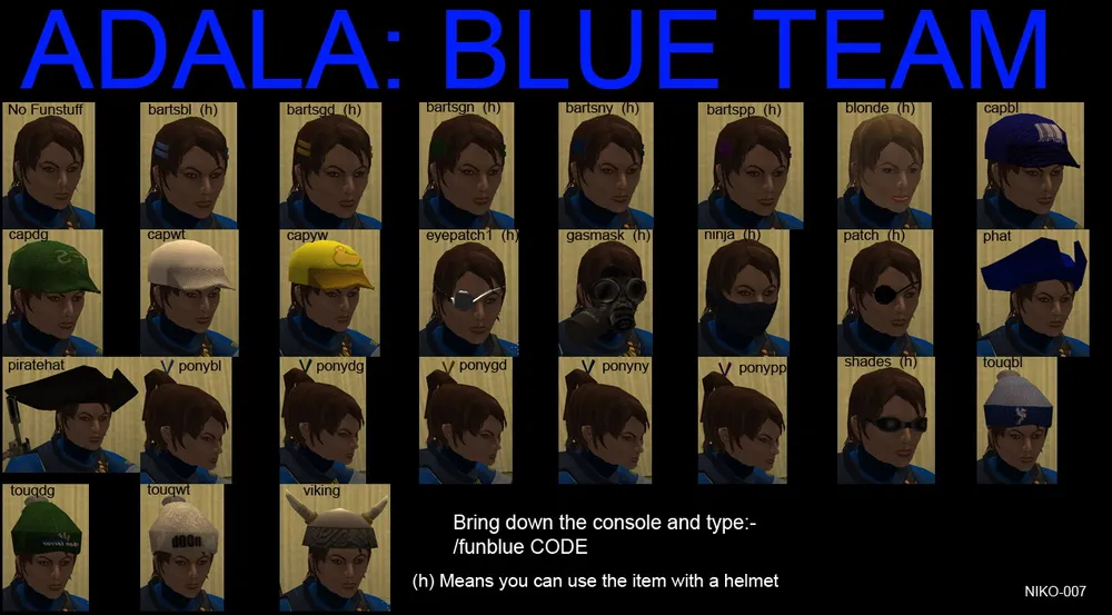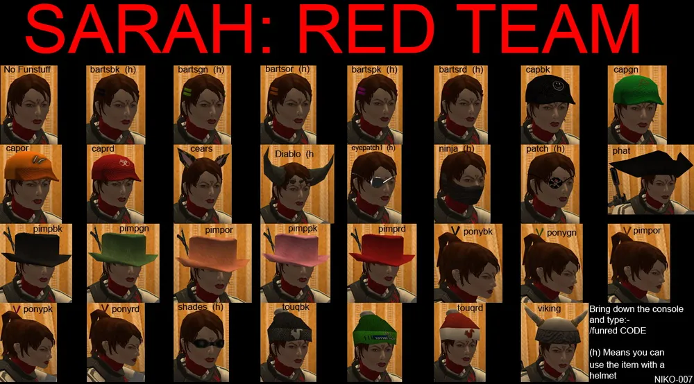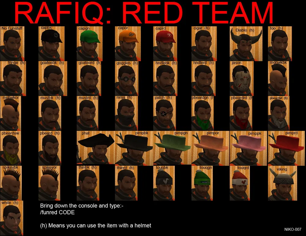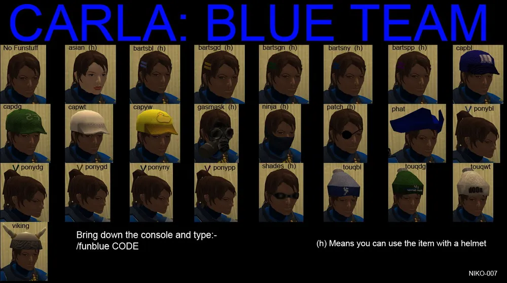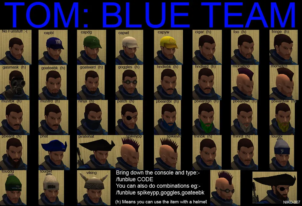 ninja, goggles, spikeypp - это названиях трёх вещей которые добавлены к моей модели на скриншотах. Повязка закрывающая рот, очки, и ирокез. Максимум - это 3 аксессуара. Естественно нельзя одеть шляпу и бейсболку одновременно, поэтому попытка сделать себе 3 ирокеза - тоже не принесет вам счастья. Еще одно замечание которое нужно сделать - прически, шляпки, кепки и прочее - это всё видно только в том случае, если на вас нет шлема. Если же вы одели на себя каску - то о пиратской шляпе можно забыть.