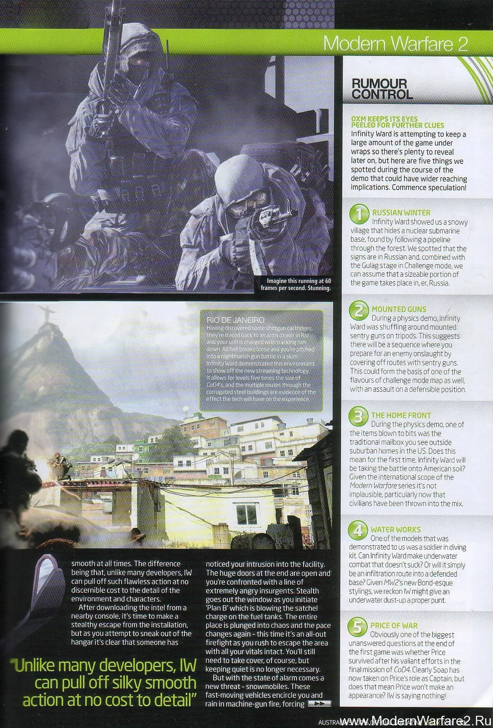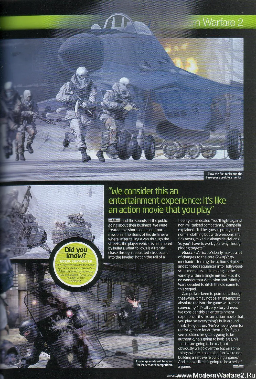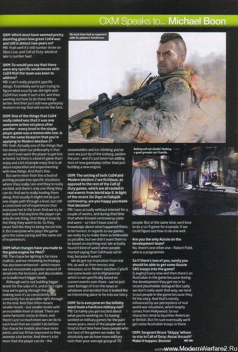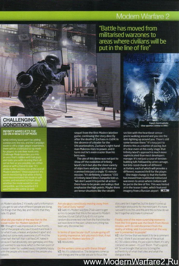 В печати уже появлялась пара журналов, повествующих очень схожие истории о Modern Warfare 2 . Добавит ли последняя статья хоть немного новой информации? Если хотите прочитать полную статью, добро пожаловать… А если вы хотите фактов и основных моментов, то читайте до конца, мы выбрали их из статьи! Статья состоит из двух частей – интервью австралийского разработчика игр Майкла Буна, работающего с Infinity Ward уже 7 лет, и пояснений по поводу того же самого геймплея, взятых из других журналов …