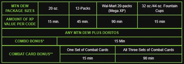 За приблизительно 0,6 литра шипучки — всего-то 15 минут набора двойного опыта в мультиплеере Modern Warfare 3 (ну и далее см. таблицу). Зато Activision Blizzard и PepsiCo гуманны: больше 24 часов двойного опыта на один аккаунт не начисляется (а то лопнут же). Прелесть акции — в том, что она сработает: MW3 популярна уже заранее. Естественно, на презентации были сказаны Слова, из многочисленных которых нам больше все понравились произнесенные главным по маркетингу в Activision Тимом Эллисом: «Call of Duty и Mountain Dew идут рука об руку». И PepsiCo с Activision Blizzard идут рука об руку, и не в первый раз.